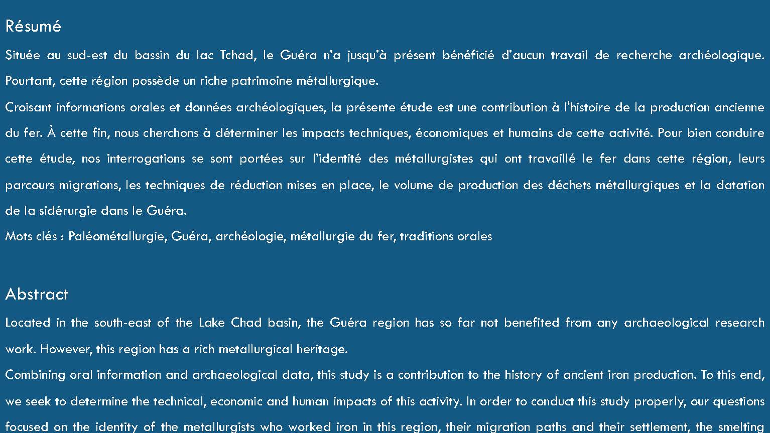 Soutenance de thèse de Djimet GUEMONA "La paléo-métallurgie dans la région du Guéra (Centre du Tchad) : inventaire des sites et essai de caractérisation des traditions sidérurgiques" - 18 décembre 2020